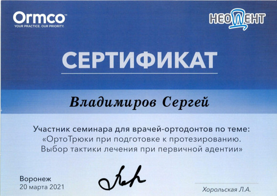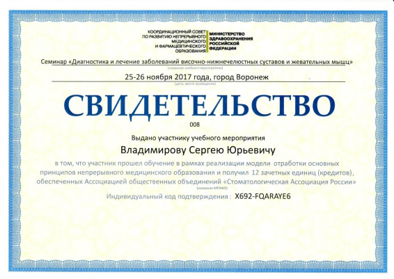 - В 2001 году прошел профессиональную переподготовку в Воронежском государственном медицинском институте им. Н.Н.Бурденко по специальности Ортодонтия.