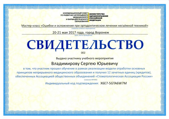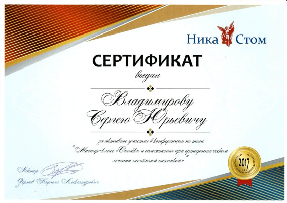 - 2017 г. — «Мастер-класс „Ошибки и осложнения при ортодонтическом лечении несъемной техникой“», Ника-Стом.
