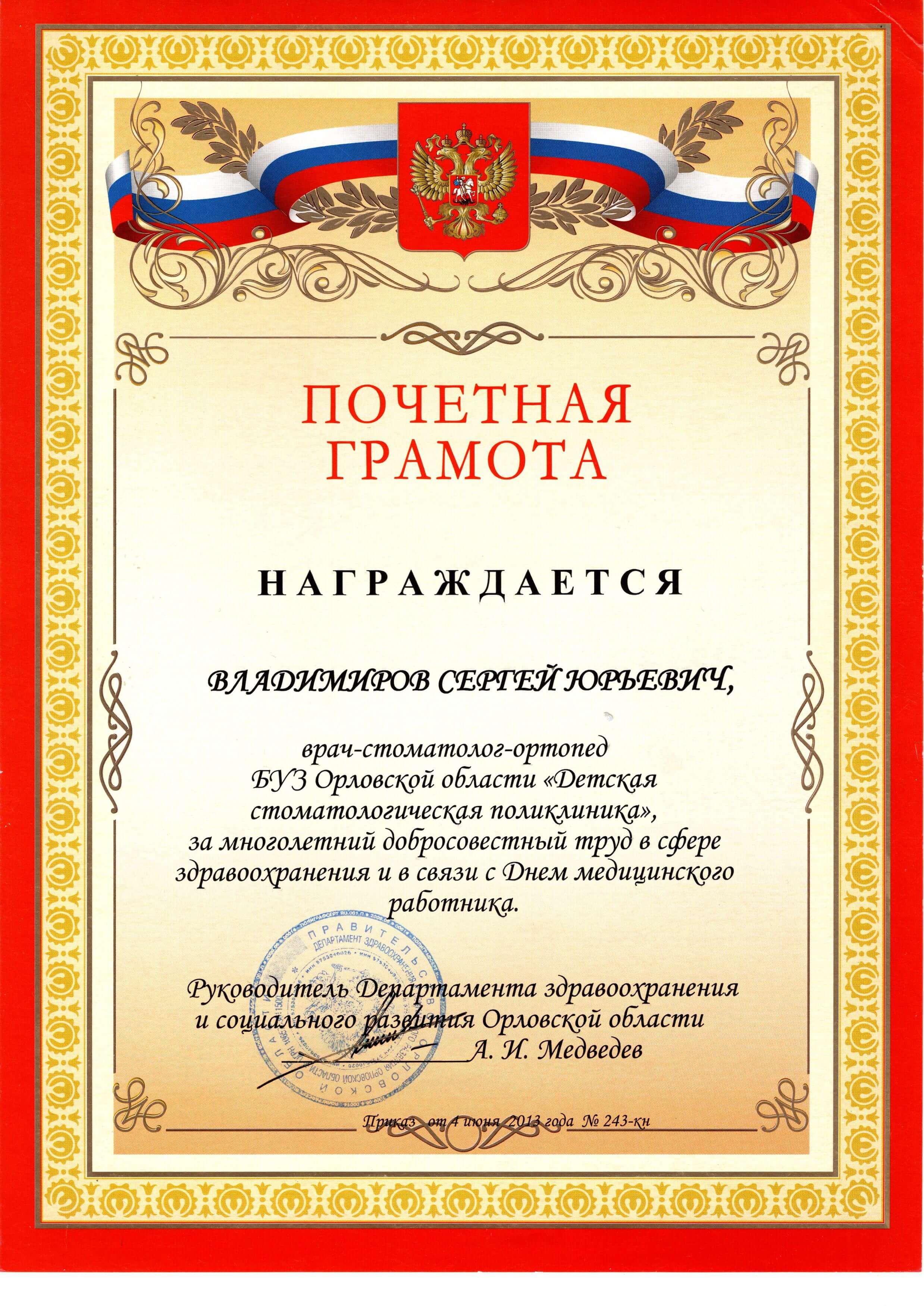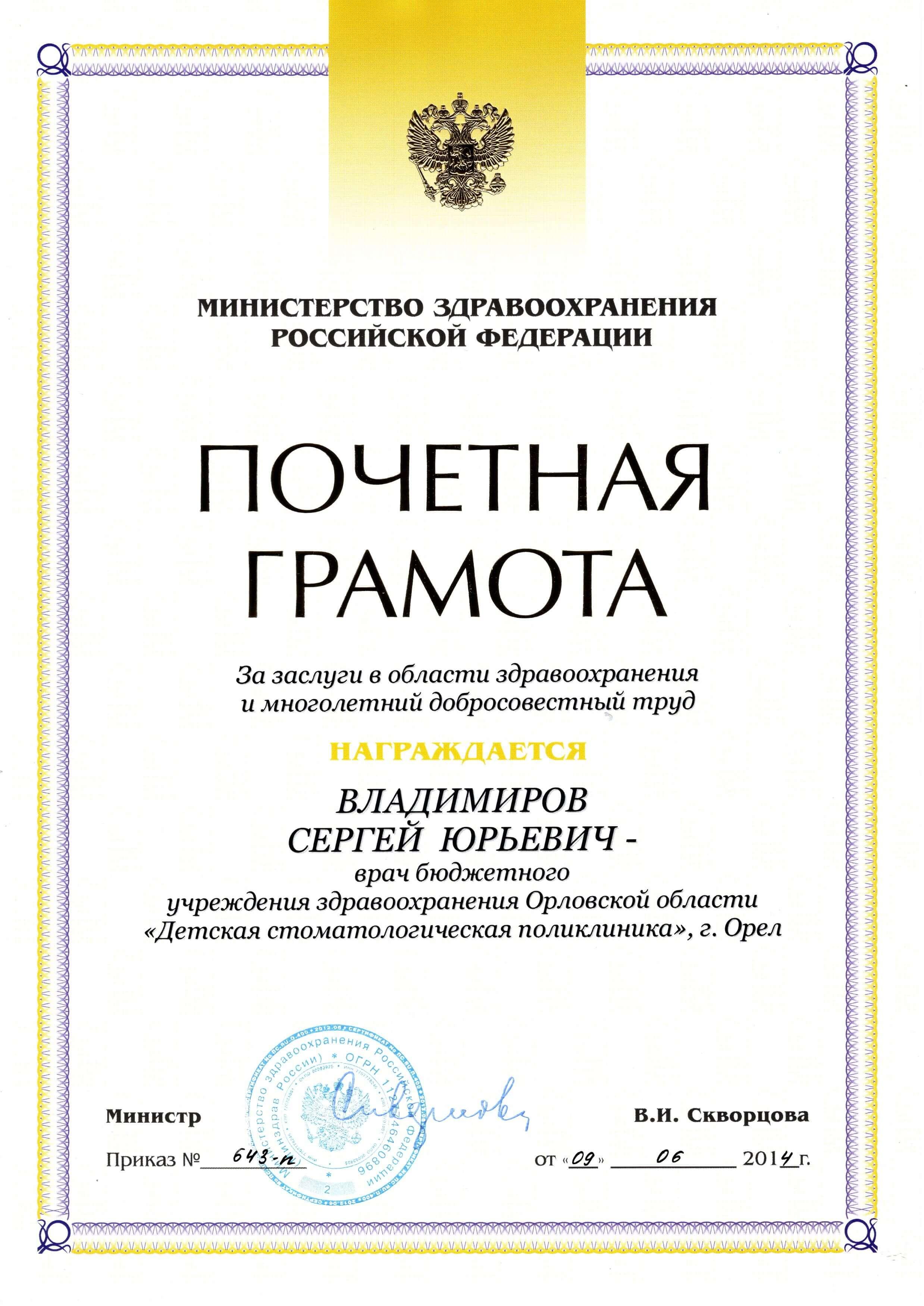 - В 2014 году награждён почётной грамотой Министерства здравоохранения РФ за заслуги в области здравоохранения и многолетний добросовестный труд.