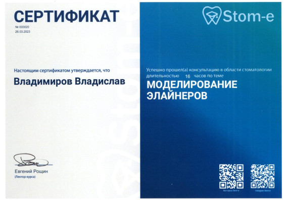 - В 2019 прошел профессиональную переподготовку в Центре специализированного образования «Прос-ресурс» по специальности Стоматология хирургическая.
