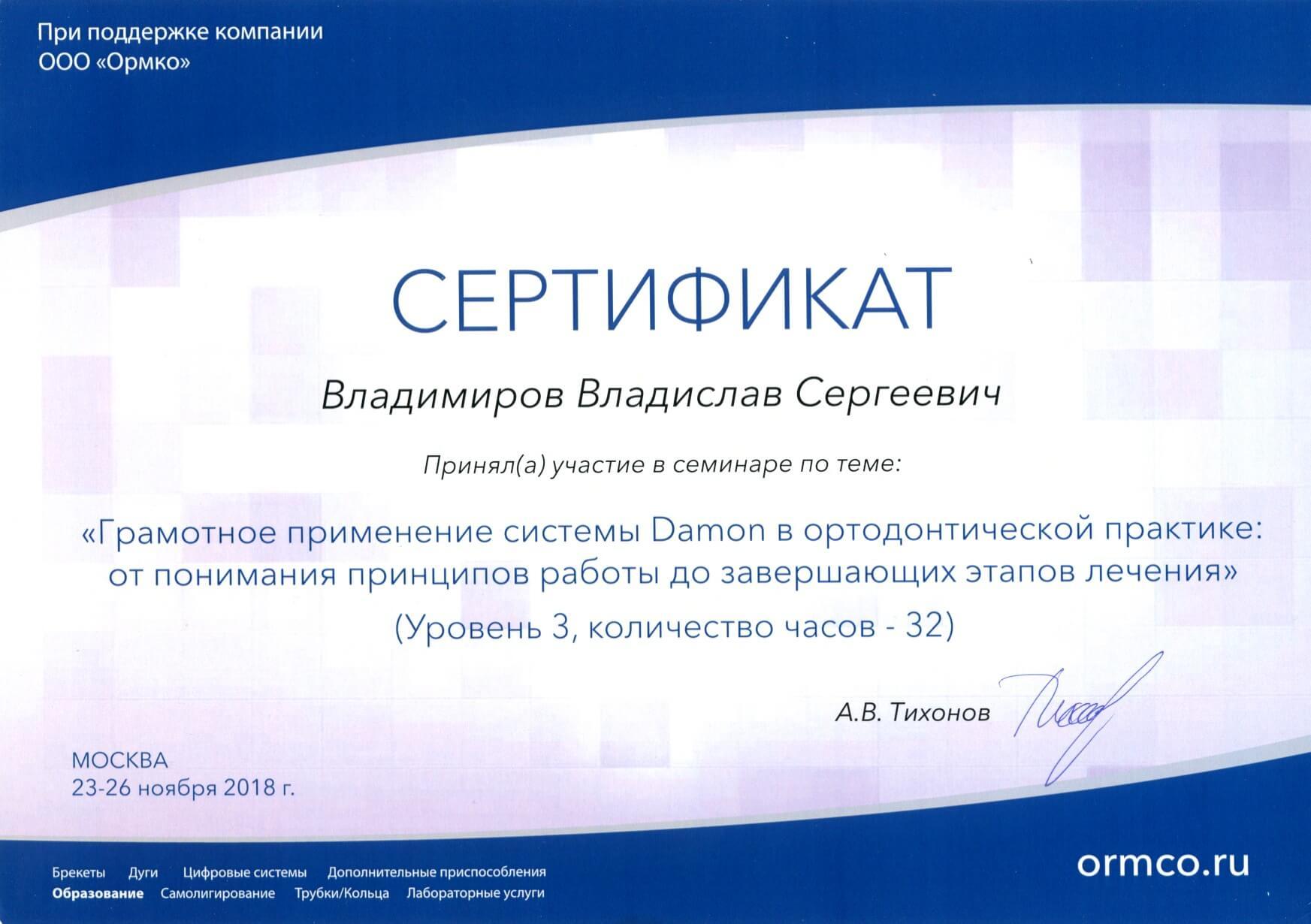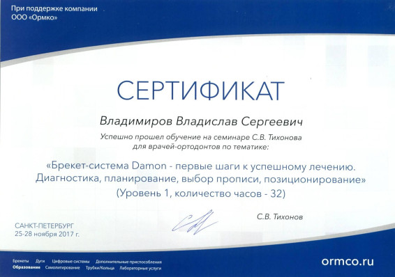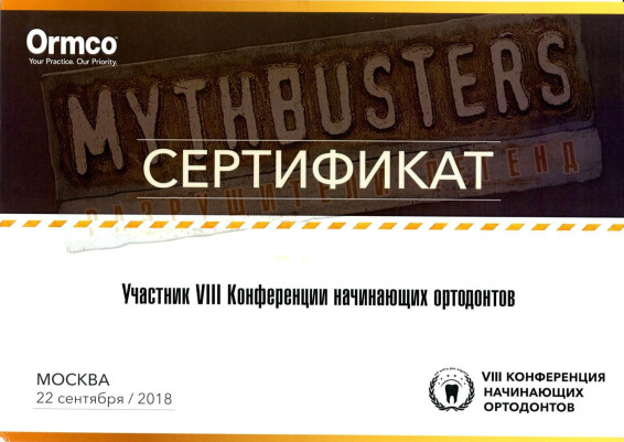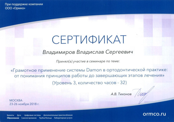- 2018 г. — «Грамотное применение системы Damon в ортодонтической практике», Ormco.